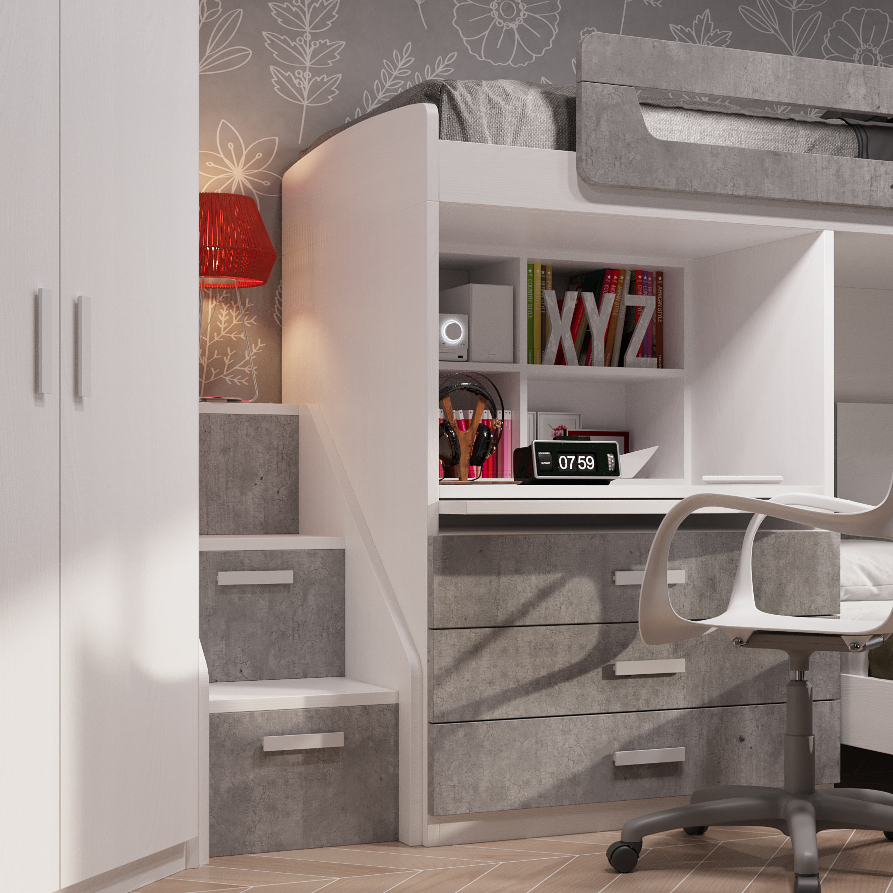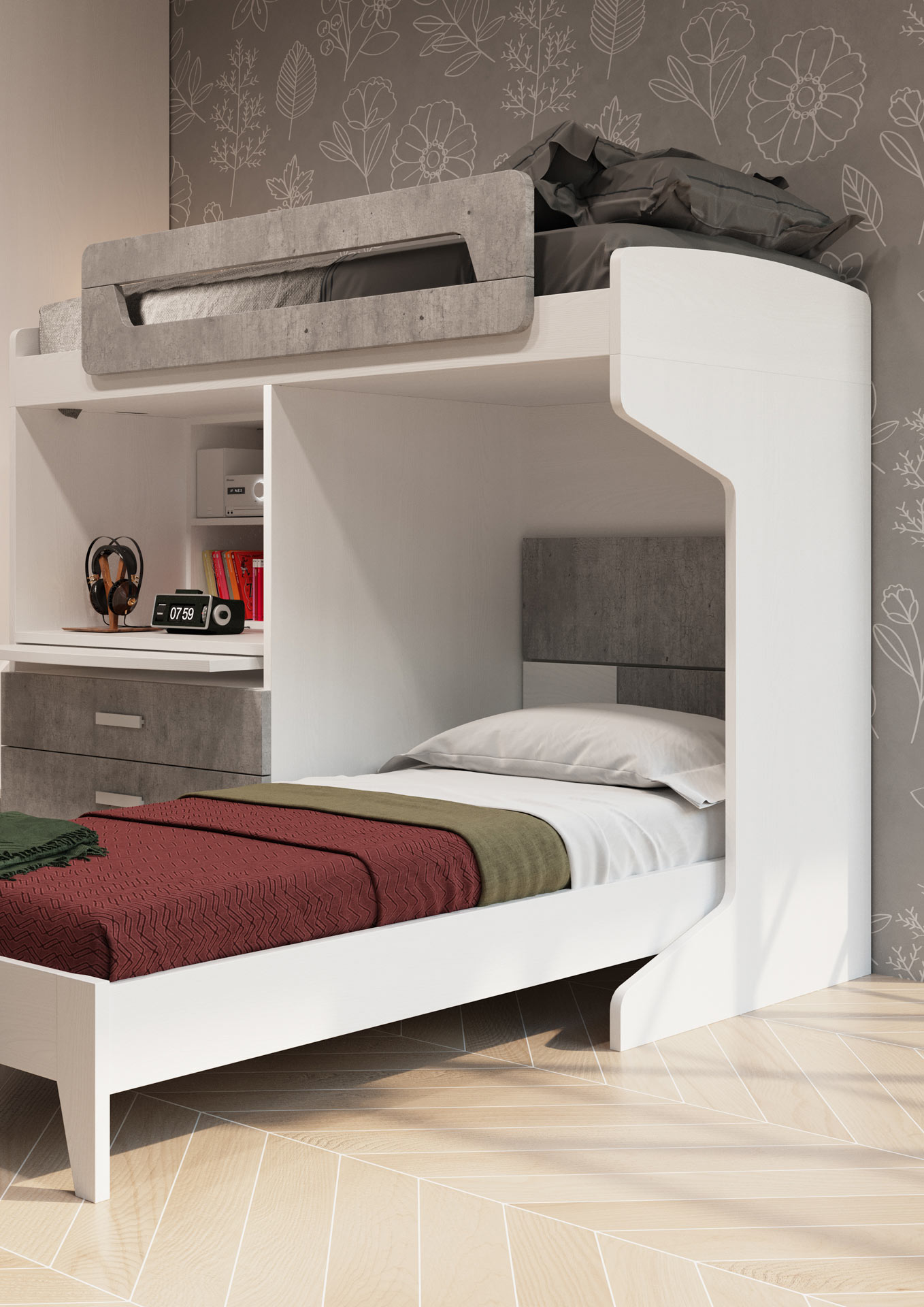 C > 1222 Armadio con cabina Terminale con appendiabiti Letto a castello con fianco free e scrivania estraibile Letto modello zoom Bianco Frassino Cemento