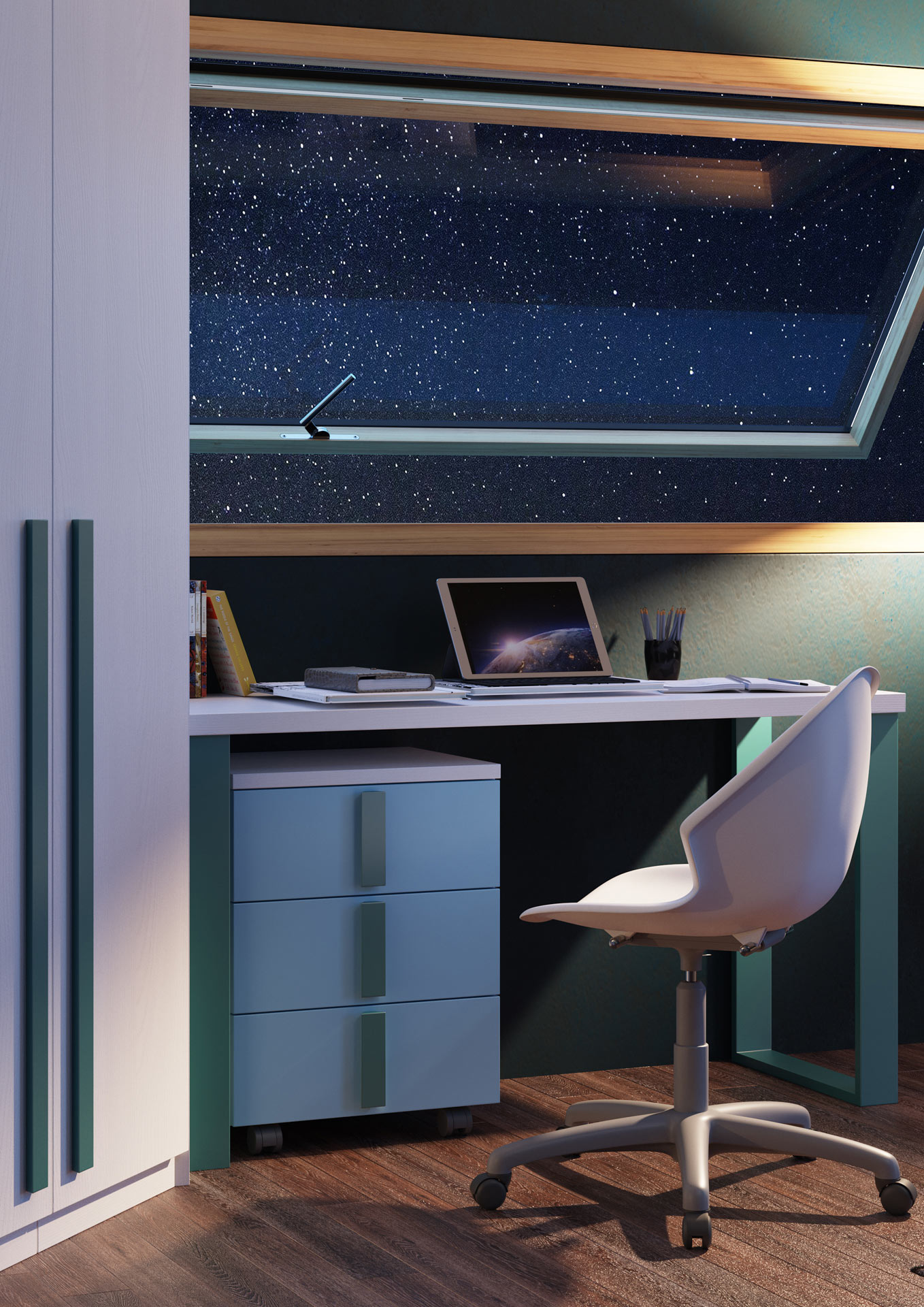 C > 1250 Cabina armadio da 120 Letto zen contenitore imbottito Scrivania con gambe delta 50 Pensili + pensili maxi Bianco Frassino Indaco Pavone