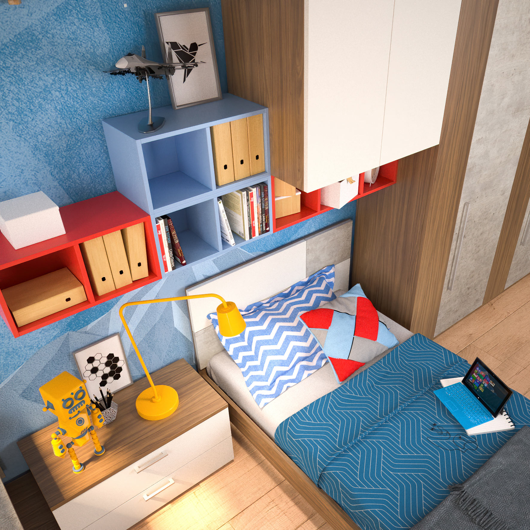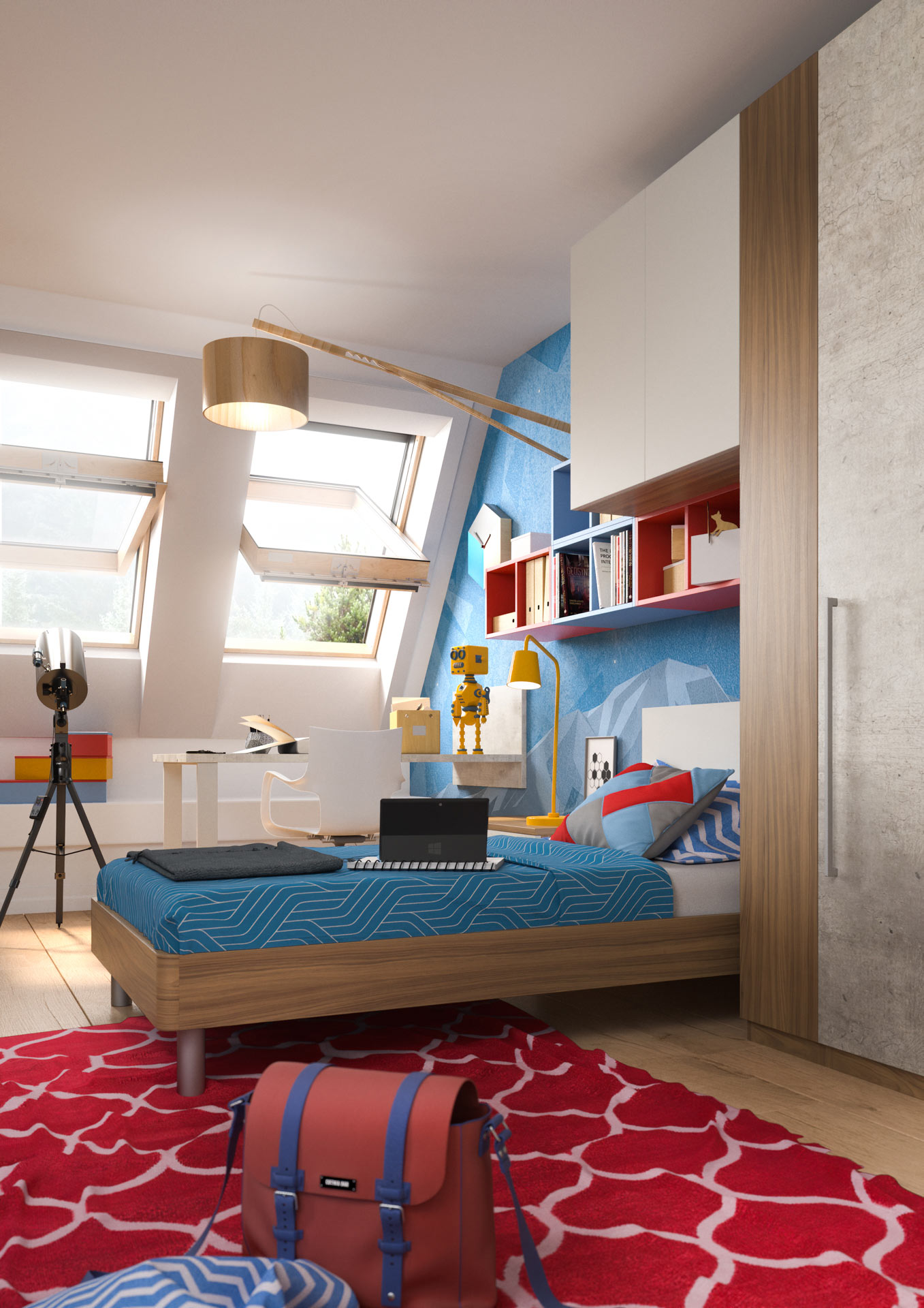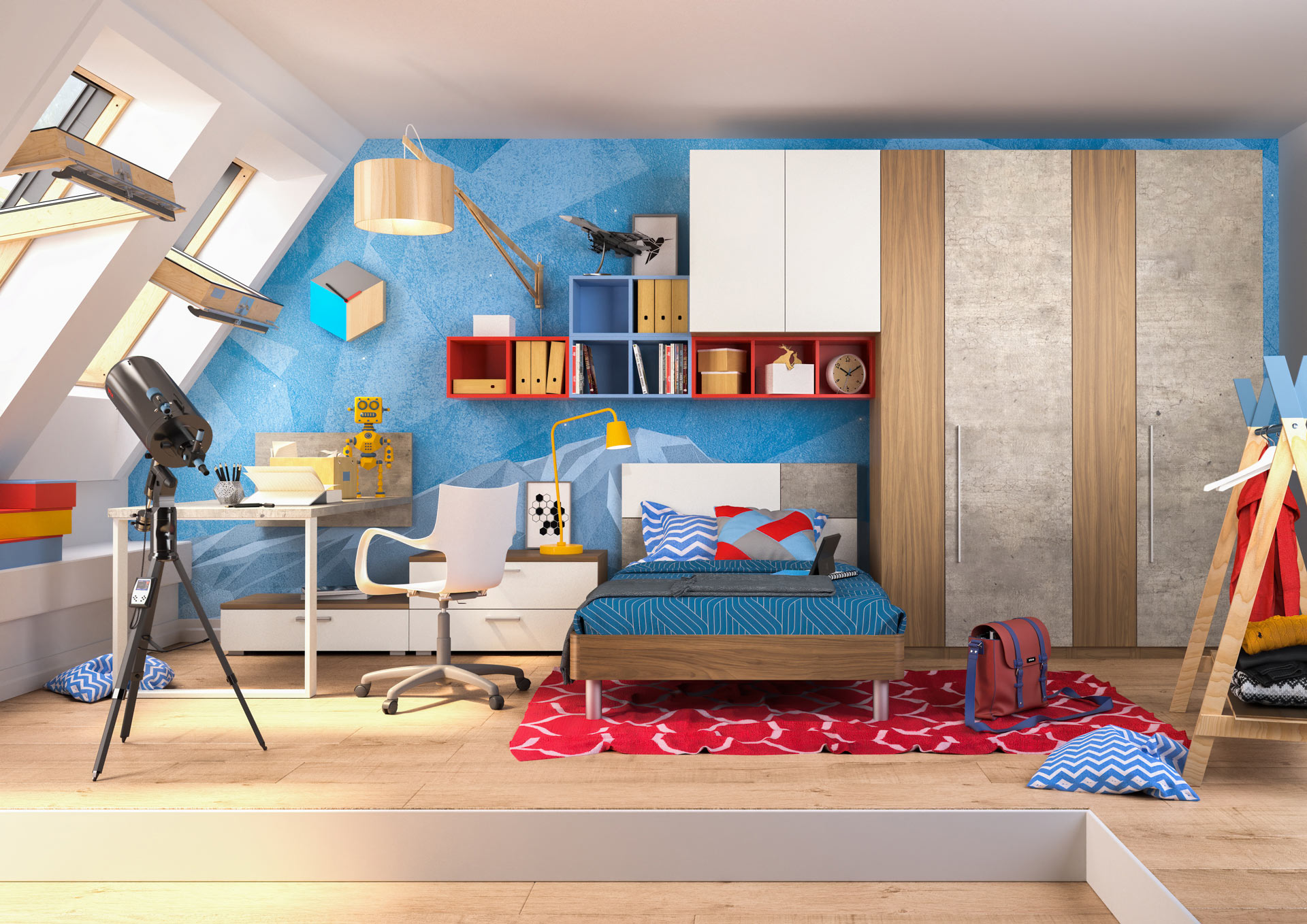 C > 1334 Armadiatura con ante 60+30 Armadio pensile sky Letto zoom da 127 con giroletto soft Scrivania extra con gamba delta 80 Noce Tabacco Cemento Magnolia Rosso Glicine