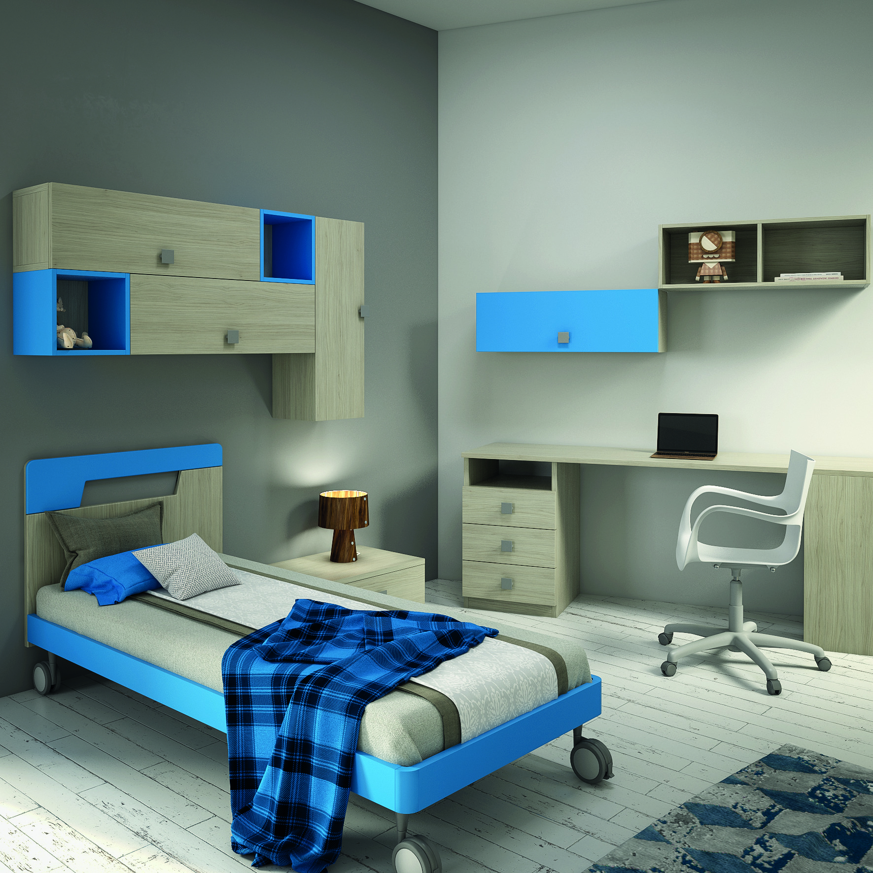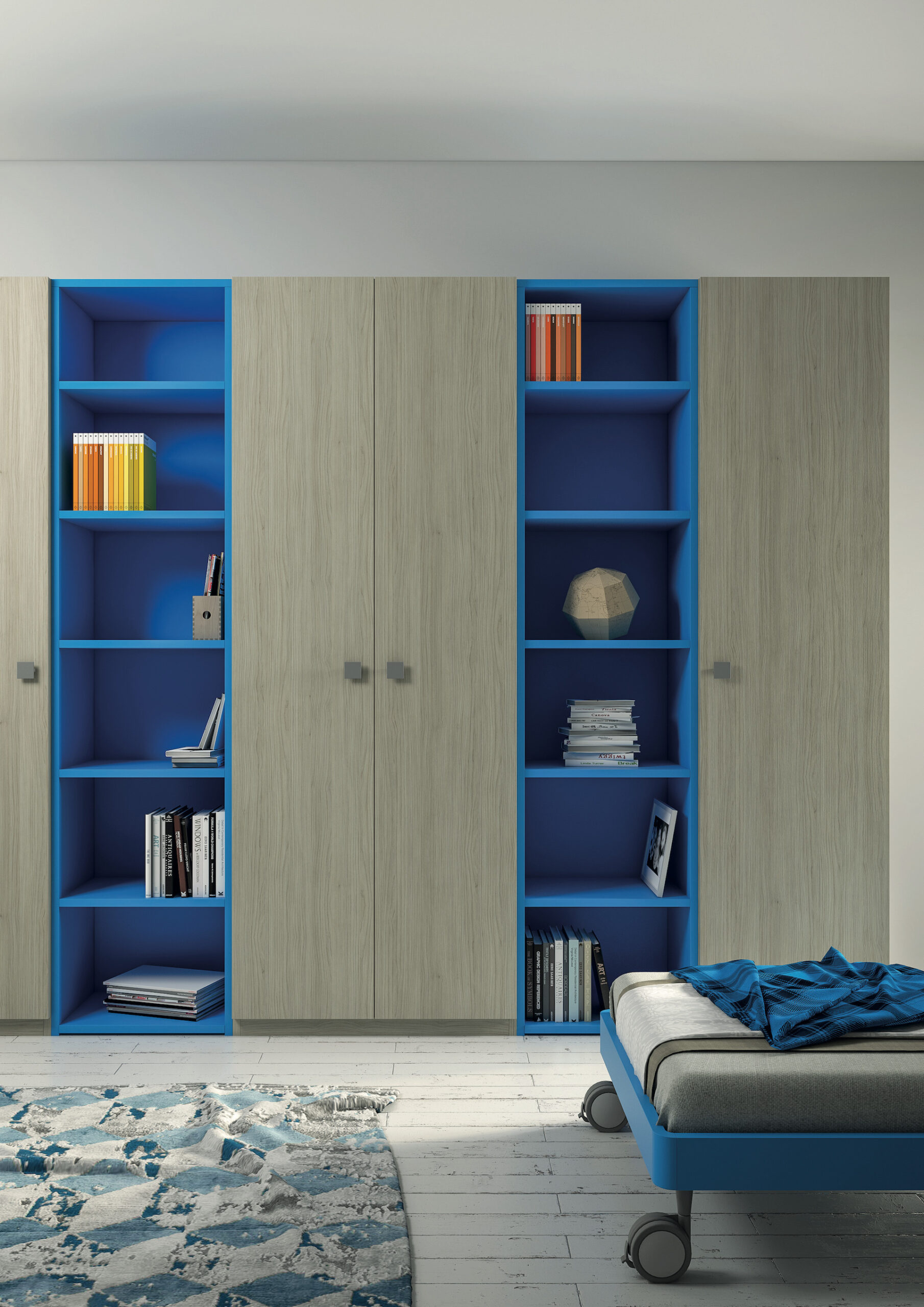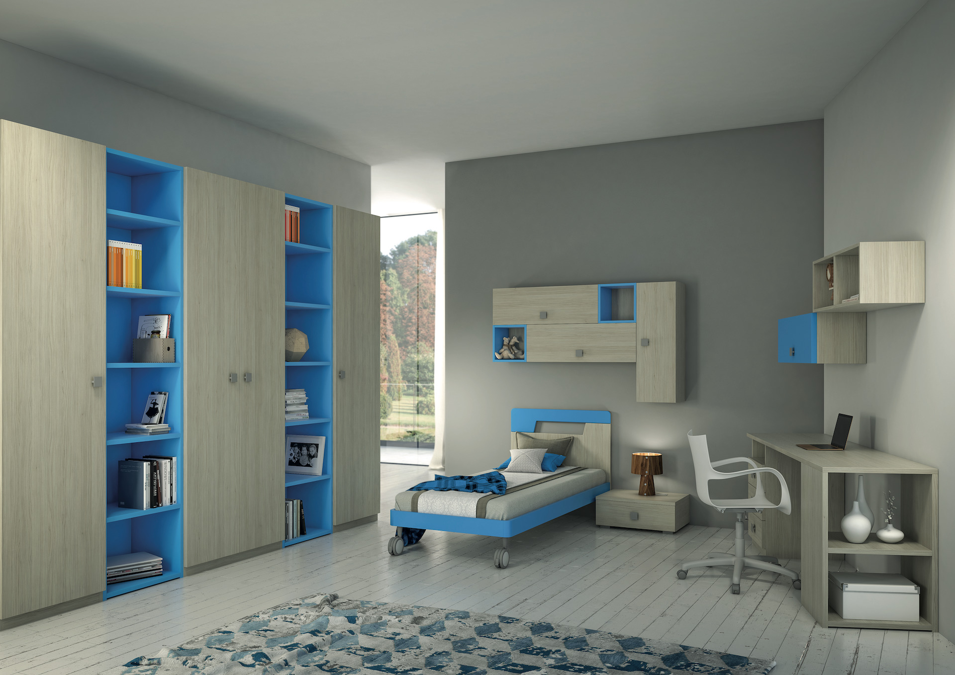 Comp 690 Armadiatura con librerie laccate Letto “roller” Comodino “small” Scrivania Sedia “star” Olmo TURCHESE